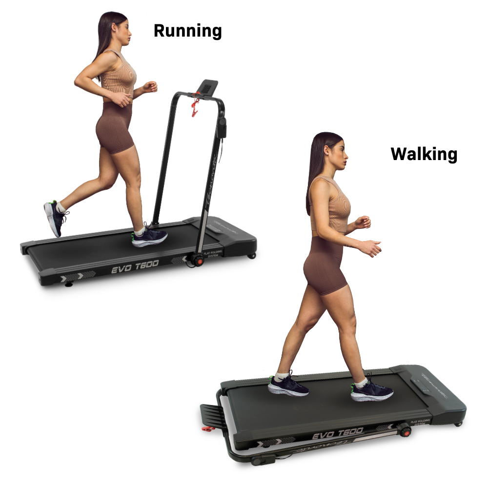 L'EVO T600 offre la possibilité de plier sa barre de façon à ce que le tapis de course puisse être utilisé pour la marche, s'adaptant ainsi à différents espaces.